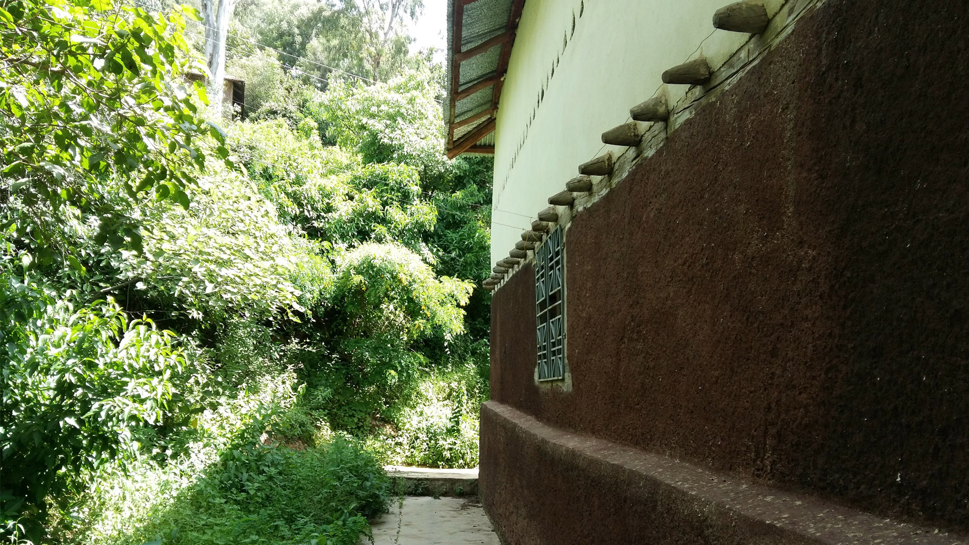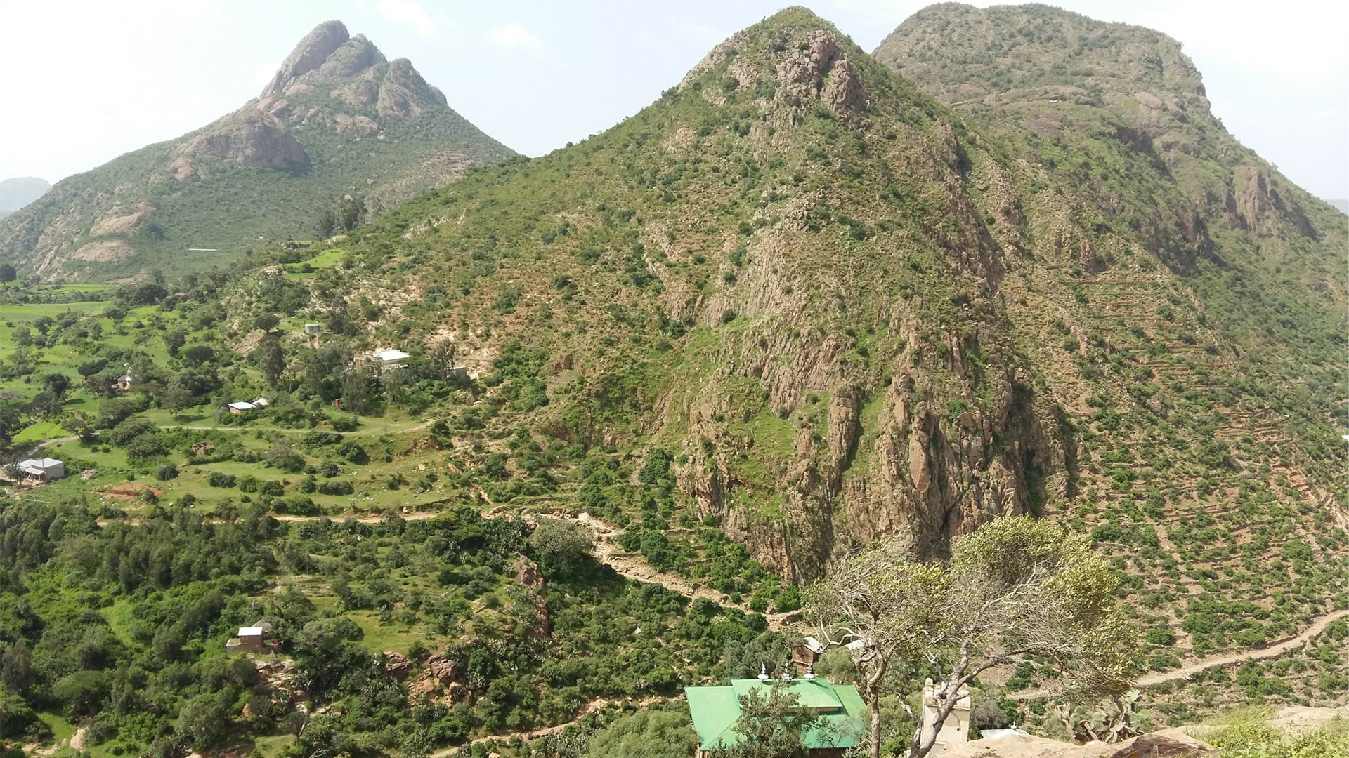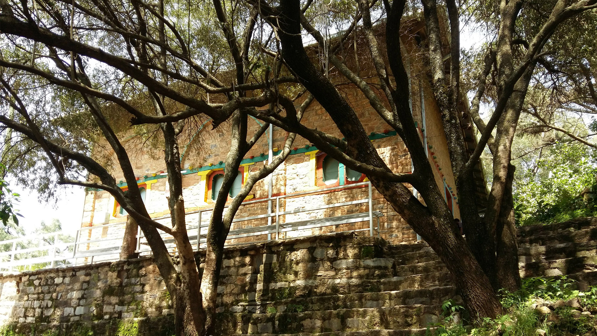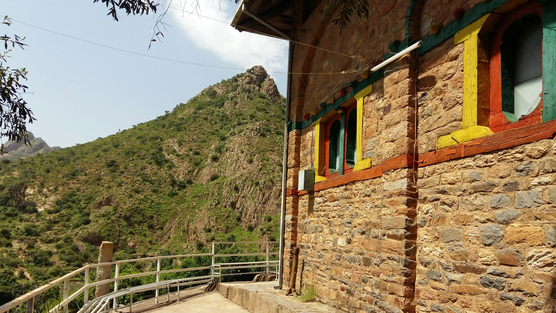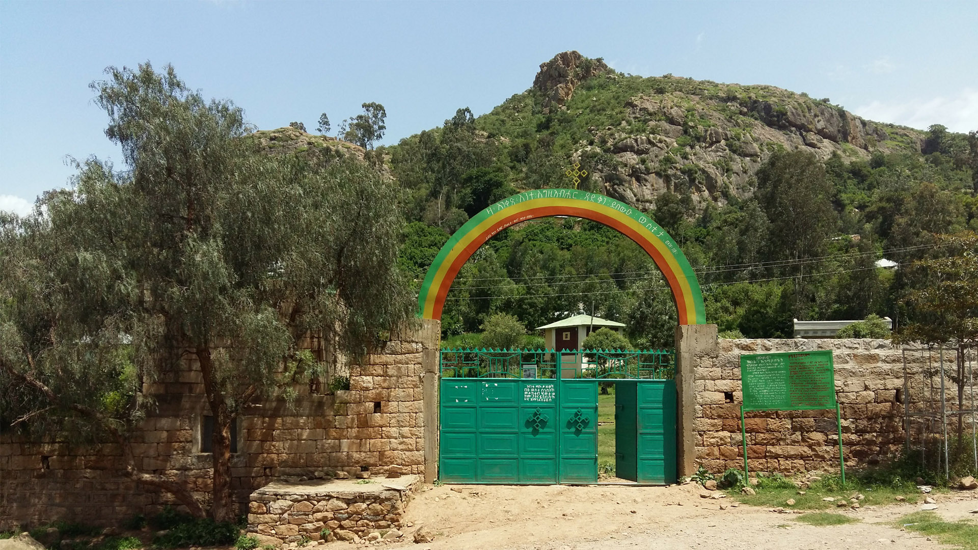 The monastery is surrounded by rugged cliffs which are covered with cactus and shrubs. The roofs of the monastery are painted green, and the window frames and doors are painted green, red, and yellow. The monastery consists of three churches, about fifteen square and circular cells in which the monks live, and a notable treasury. The entrance to the treasury is a stone portal with steps and inside the round building is a glass cabinet as wide as the room. They contain an extensive collection of crowns, helmets, crosses, chalices and manuscripts and other treasures from the various emperors and religious figures of Ethiopia dating back to the monastery\’s founder, Gabra Masqal whose silver cross with gold inlays remain, as does the crown of Zara Yaqob (1399–1468). There are also other items such as a pair of cow horns embedded in the wall, and leather bible satchels for the monks to preach in nearby villages.