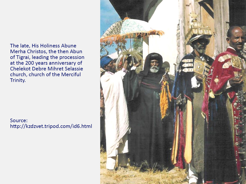 Chelekot is the birthplace of Ras Araya Dimtsu of Enderta chief crown councilor to Emperor Yohannes IV of Ethiopia 1867-1889. Ras Araya was also an influential governor of Tigrai and Akale Guzay. He died at the battle of Metema while fighting against the Mahdists of Sudan along with Emperor Yohannes in March 1889. He is the maternal uncle of Emperor Yohannes. Emperor Yohannes’s mother, Amate Silas Dimtsu is also from Chelekot where she was born from her father Dejazmach Dimtsu Debab of Enderta, some time hereditary chief of Enderta in the 1820s and 1830s. Chelekot is also the burial place of Empress Tiruwork Wube the granddaughter of Ras Wolde Selassie, and the widow of Emperor Tewodros II, Mum of Prince Alemayehu. Emperor Menelik II paid a visit to the churches of Chelekot on his way to the Battle of Adwa and gave his robes of state to the Church of the Holy Trinity (Mekdese Selassie) as thanks for his victory over the Italians where they are still displayed.