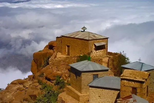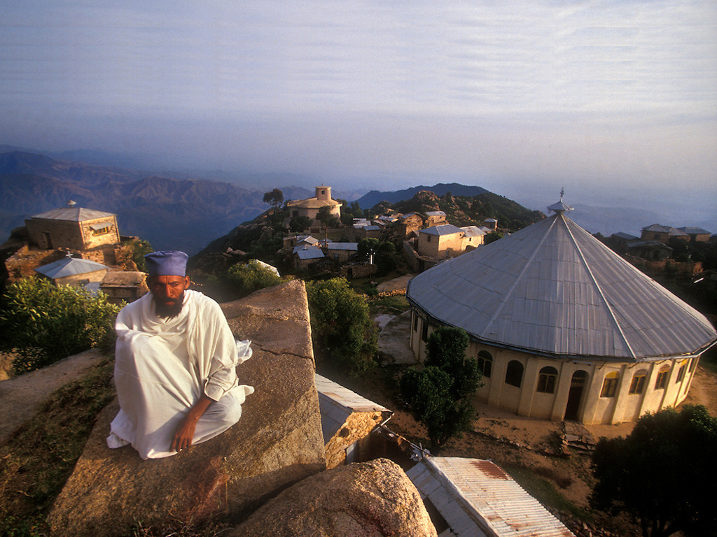 The spot commands magnificent views of the surrounding hills and all the way down to the line of the Red Sea coast. The atmosphere of the settlement, surrounded by a grove of rare indigenous trees, is pious and medieval, other-worldly and even magical. At night the lights of Massawa sparkle in the distance. On the day the air is cool, there are birds singing and green grass grows between the monastery buildings. At dawn, a carpet of glistening white cloud often hides the earth below where the village of Nefasit with its yellow and green-domed mosques and a Coptic church nestles at the base of the mountain. The views to the sea and Dahlak Islands, to the Buri Peninsula and the Gulf of Zula, and south to the mountains of Akele Guzai, are the most impressive in Eritrea.