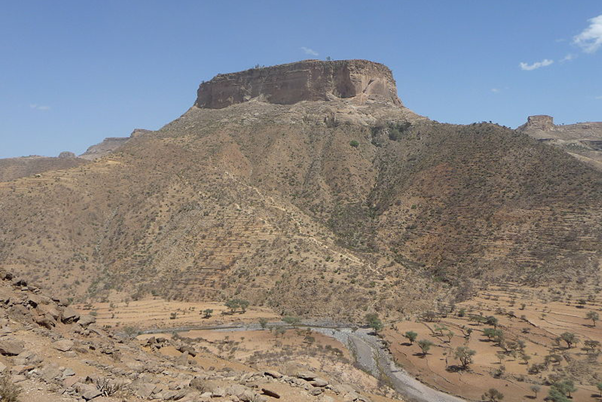 Debre Damo monastery is situated on an isolated mountain in the central part of Tigray. It is unique compared with most African monasteries. It was built, in the sixth century AD, with carved wood panels, painted ceilings, and walls dedicated to the legend of Saint (Abune) Aregawi.