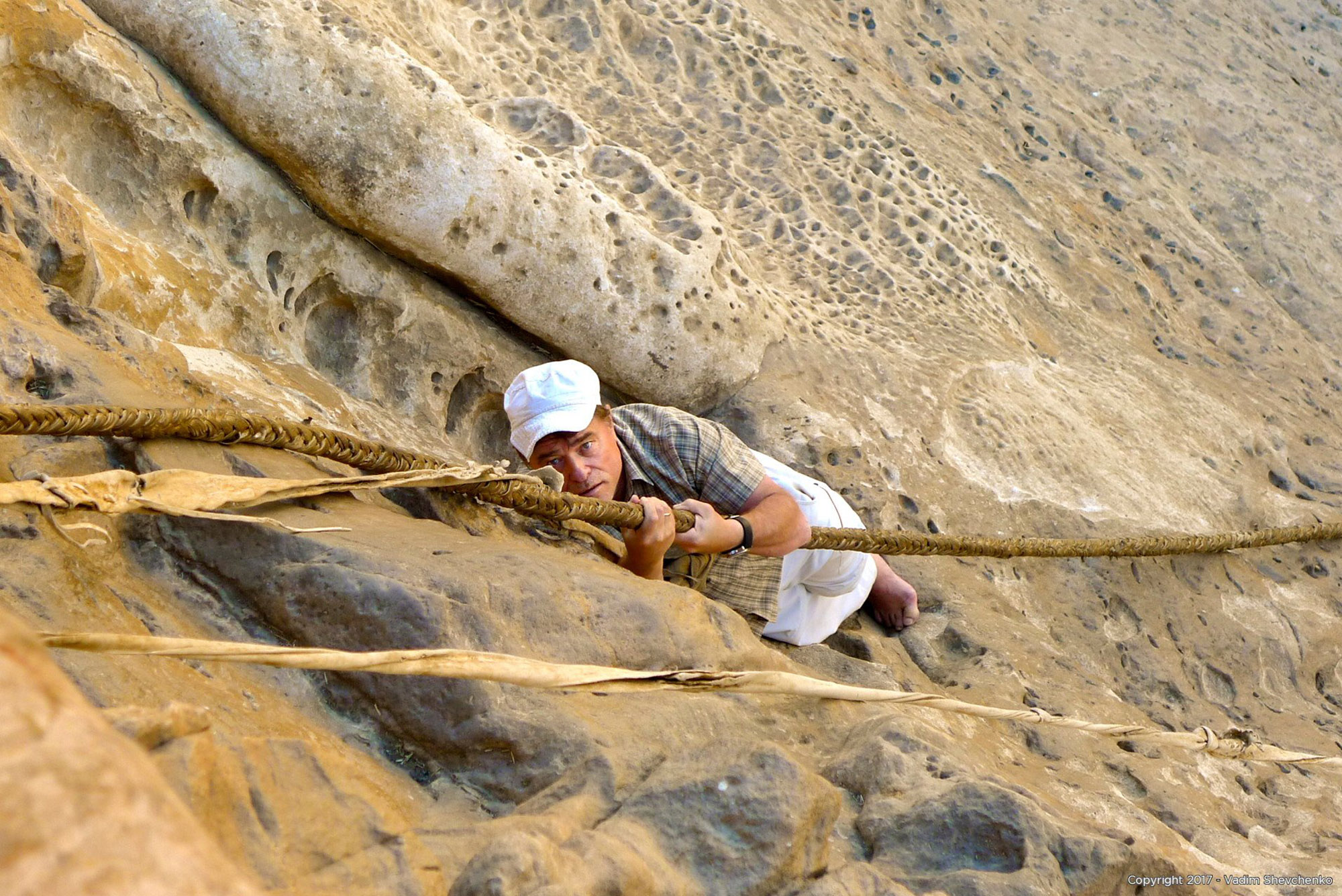 Since then people have been using thick ropes made of animal skins. There are two types of pulling ropes. The first one is used for transporting different kinds of materials, such as foodstuffs, animals, dead bodies, books, holy artifacts, candles, etc. The second one is totally different from the first one and is solely used for pulling people up. People familiar with the story of Abune Aregawi call it ‘serpent’ and is prepared from five oxen skins. It’s impossible to hold this rope with one hand. It’s very thick and should be firmly held with both hands. It’s tied around the waist for safety reasons. There are some grooves for landing your feet on the rocky hill. People climbing up using this rope have to go straight 60 meters up. For weak and inexperienced hikers, due to its tiresome nature, most people, especially new hikers are initially pulled up by a monk from atop the rope the first 15 meters and take by themselves the rest 45 meters after a landing break in the middle. When finished with the hiking, people have to walk on 94 more staircases with their confidence left.