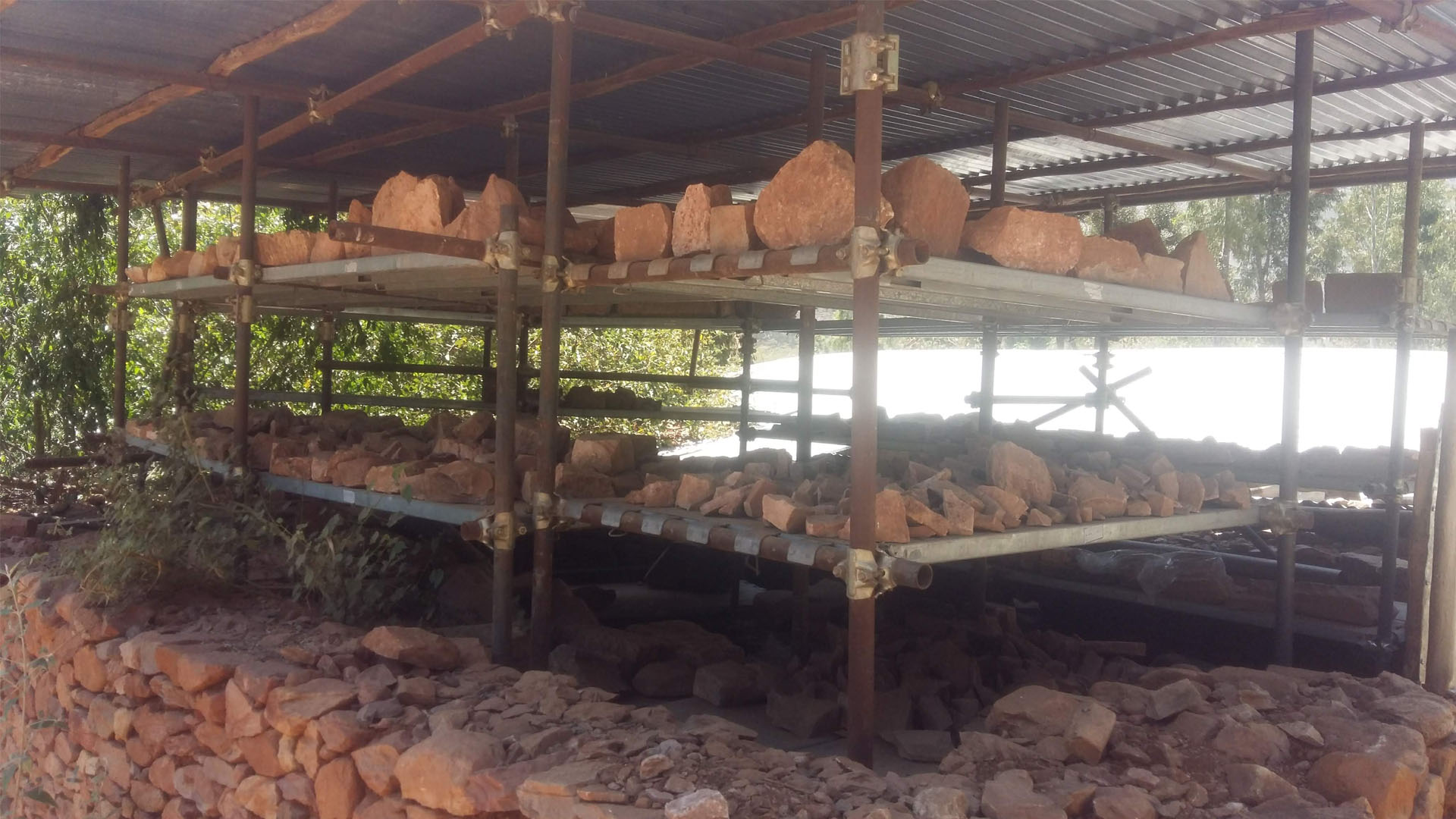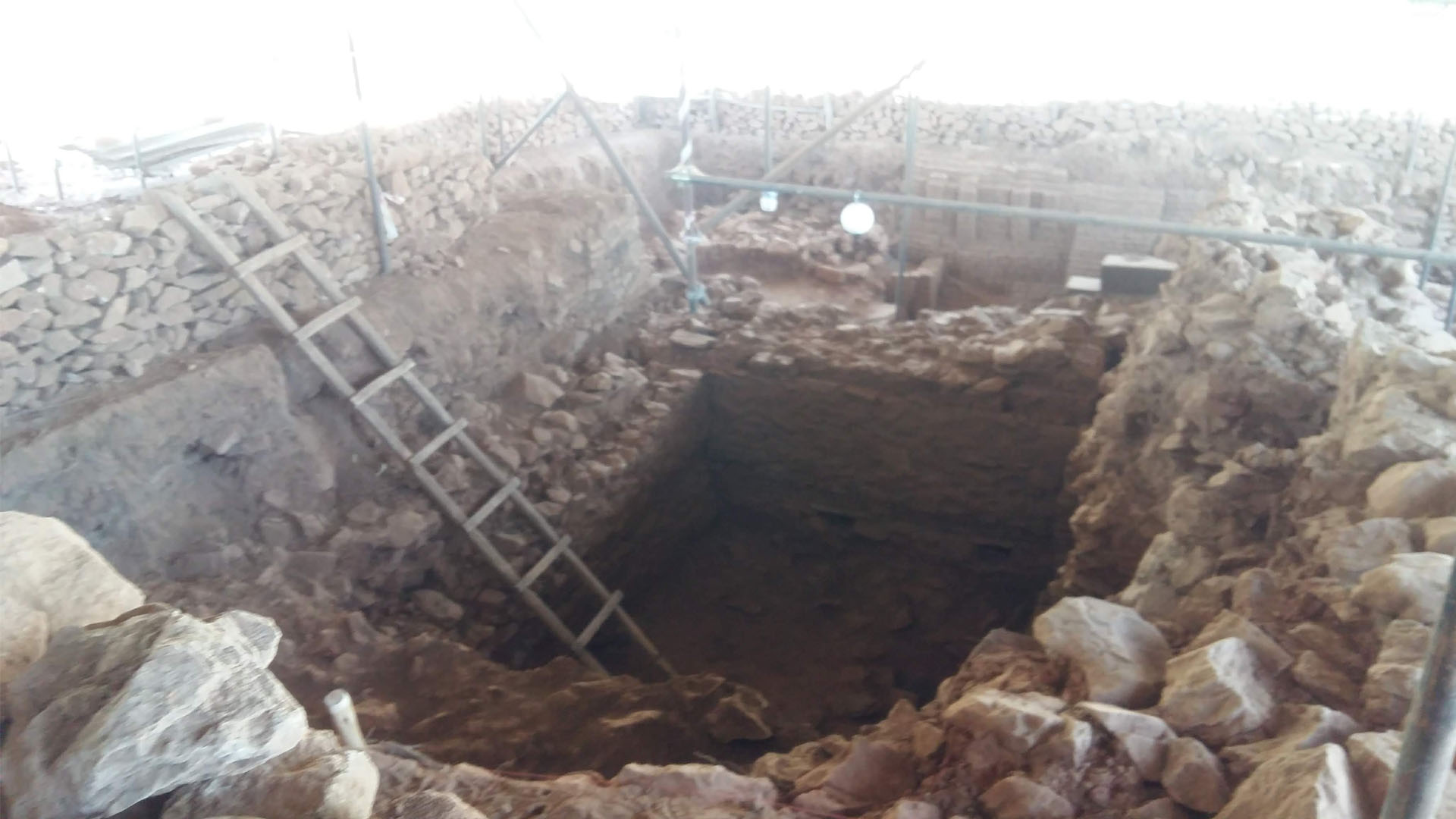The front of the building once also had a propylon with six pillars, the bases of which have been preserved. The stairs leading up to the propylon are missing, although the foundations are visible. Behind the propylon, there was a huge gate with a narrow opening, with two massive stone doorposts. Wooden beams were inserted horizontally along the walls and penetrating into them. Radiocarbon dating of the wooden beams dates construction between the early 8th–late 6th centuries BCE.