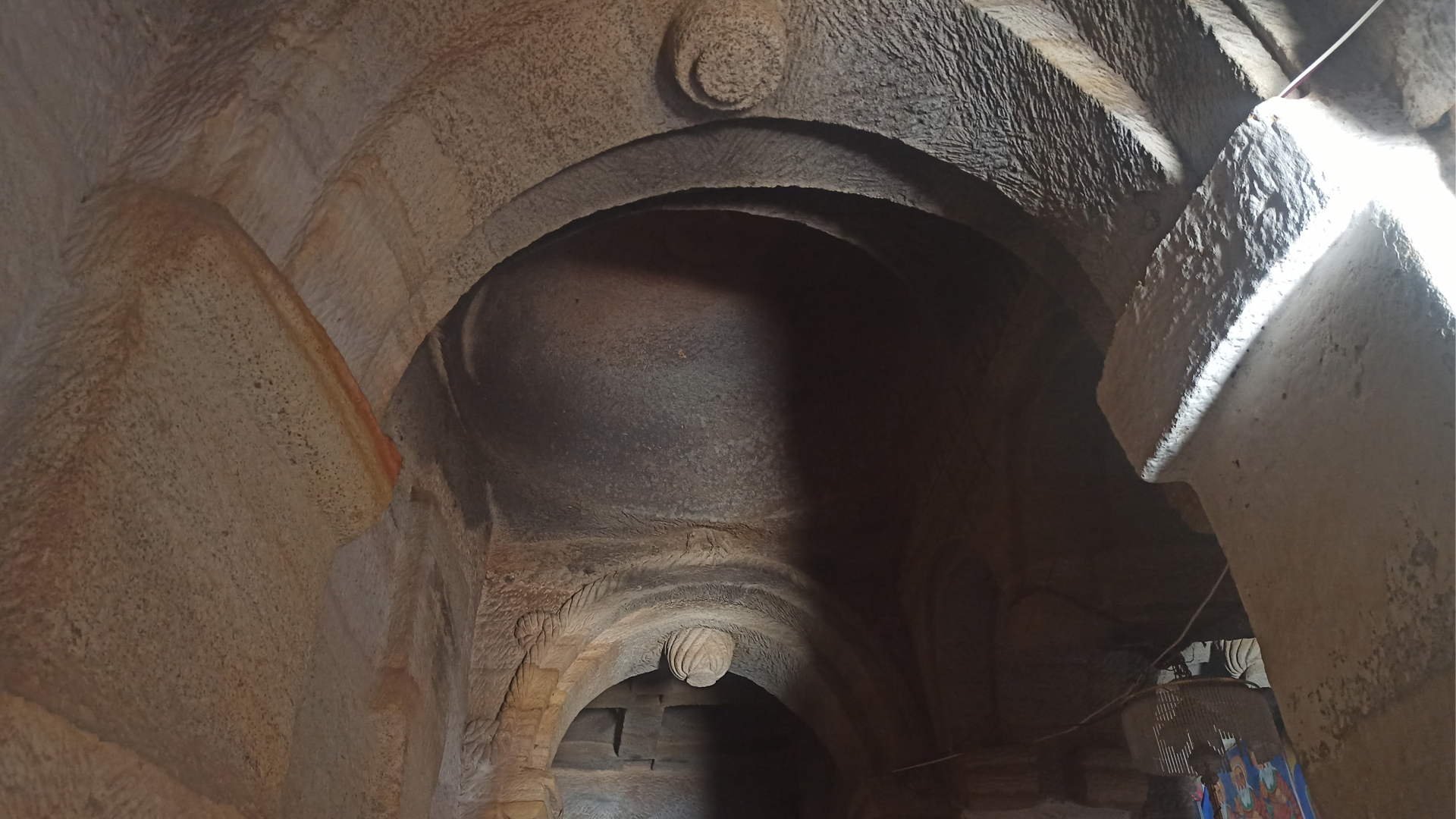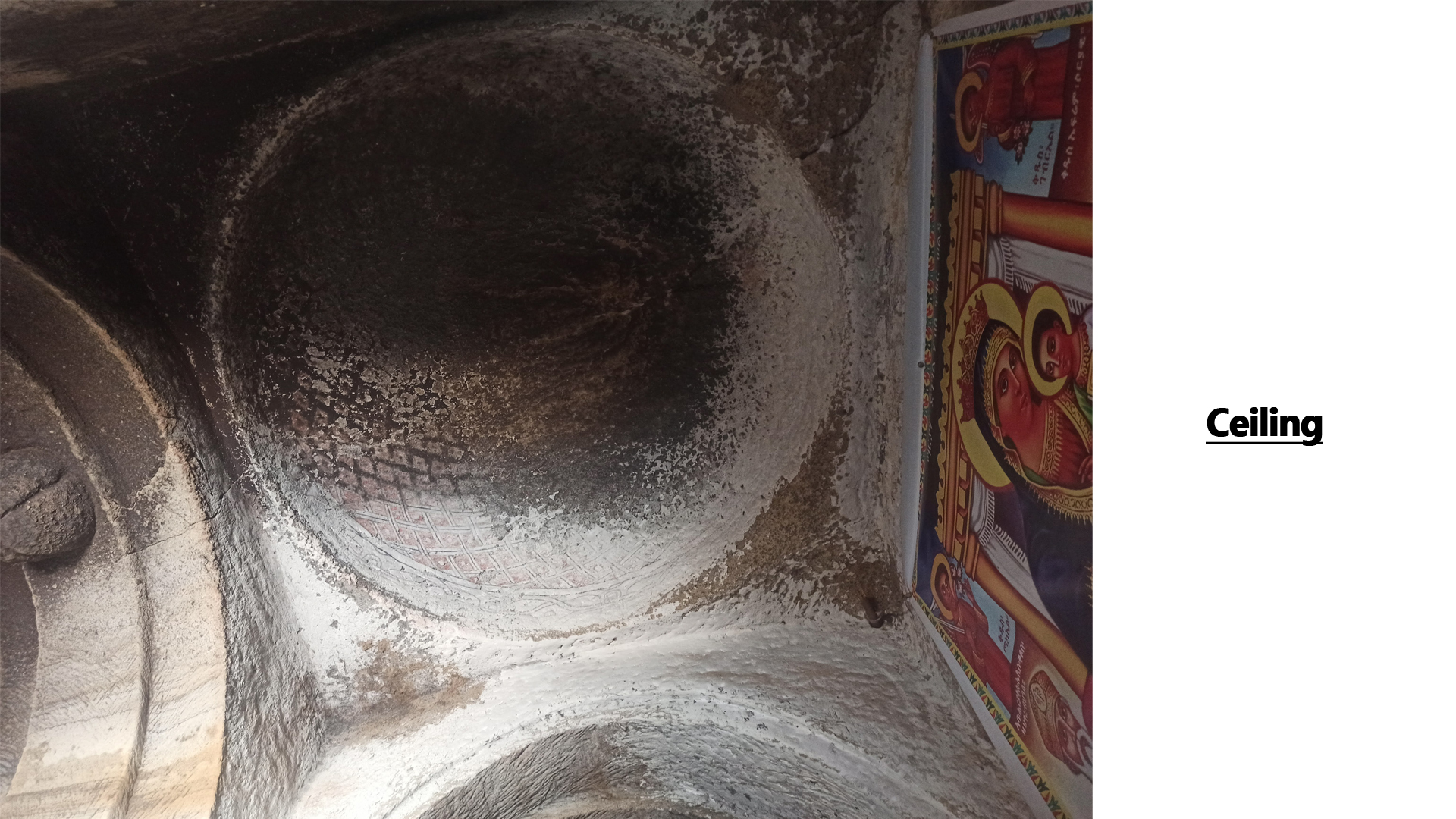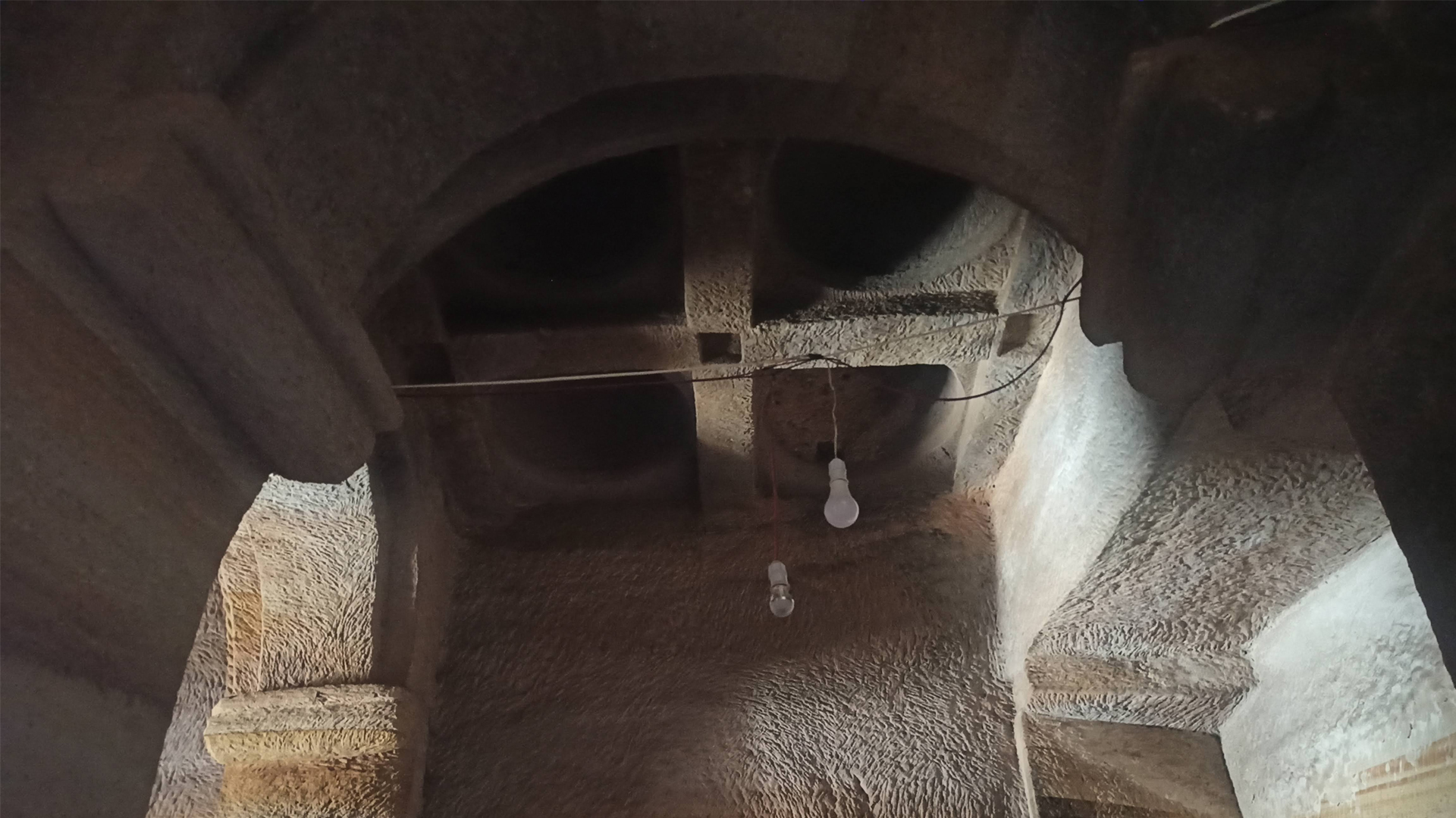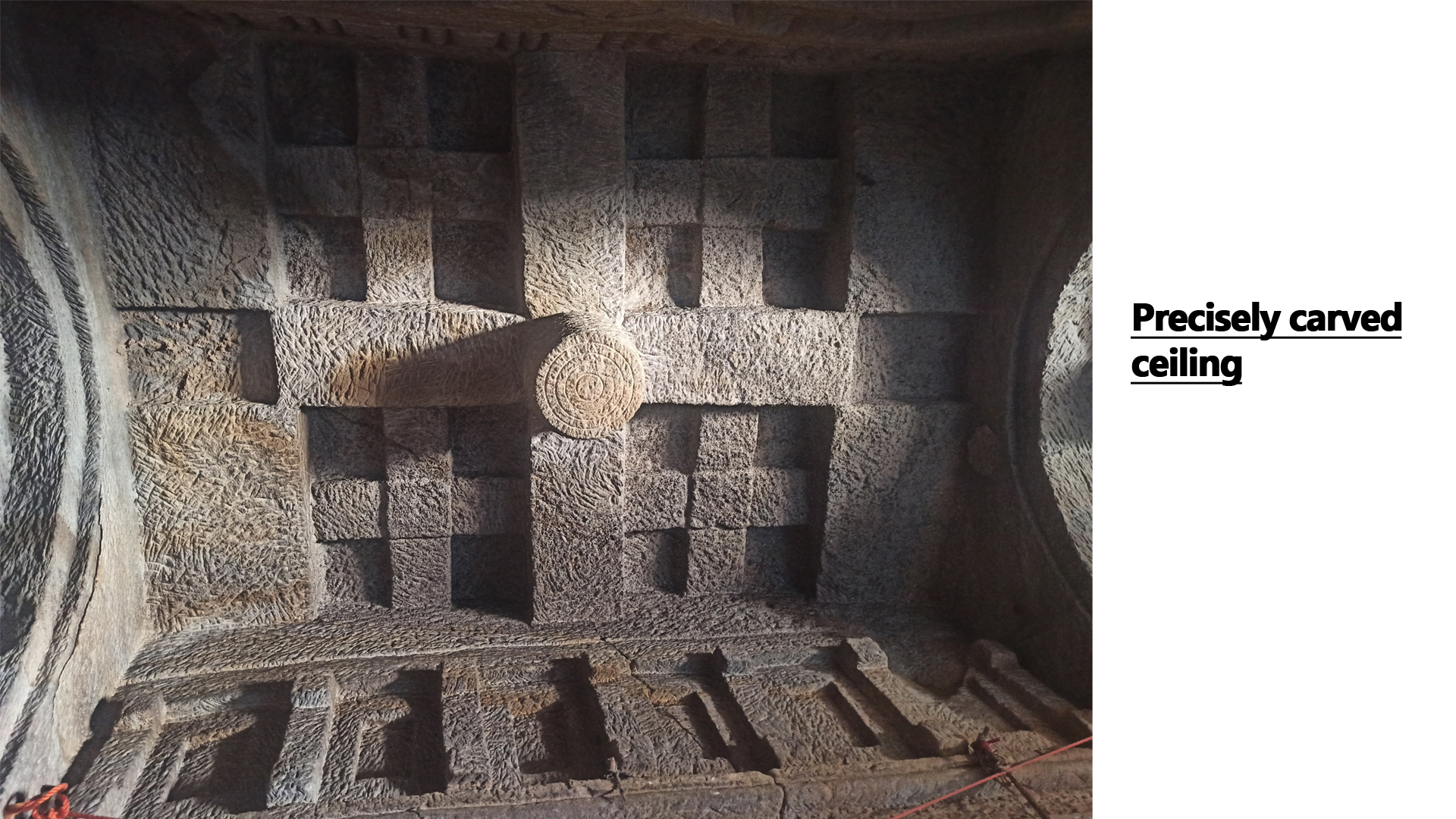 Its interior is accurately carved, with three aisles and a depth of three bays, with the central bay soaring considerably above the level of the ceiling rock of the side aisles.
