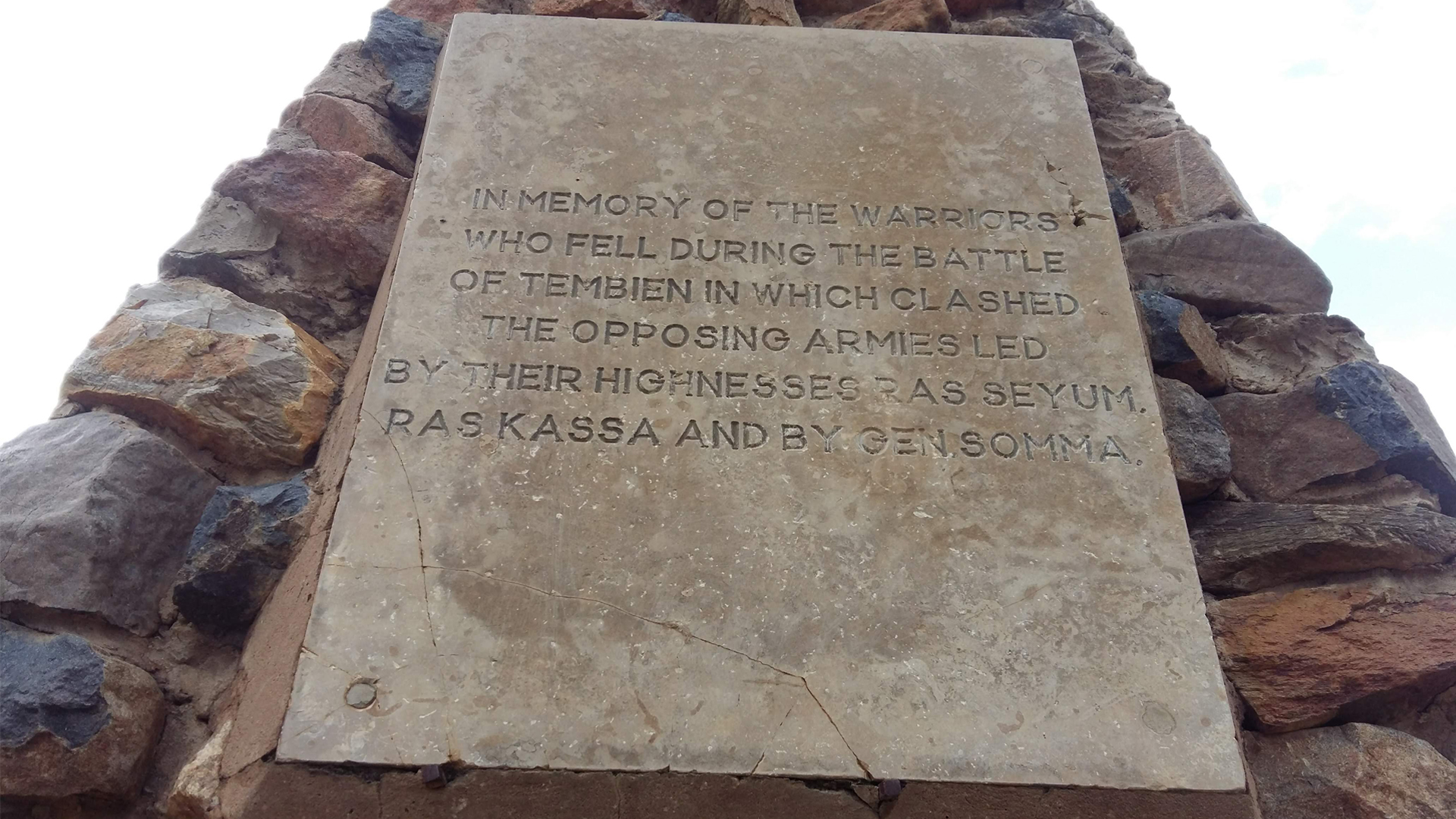 There is another stale some 300 meters to the south of the cemetery built to commemorate all the fallen heroes, heroins and humankind in general from both sides. Its caption, written in three languages Amharic, English and Italian, goes “In memory of the warriors who fell during the battle of Tembien in which clashed the opposing armies led by their highness’s Ras Seyum, Ras Kasa and by Gen. Somma.
