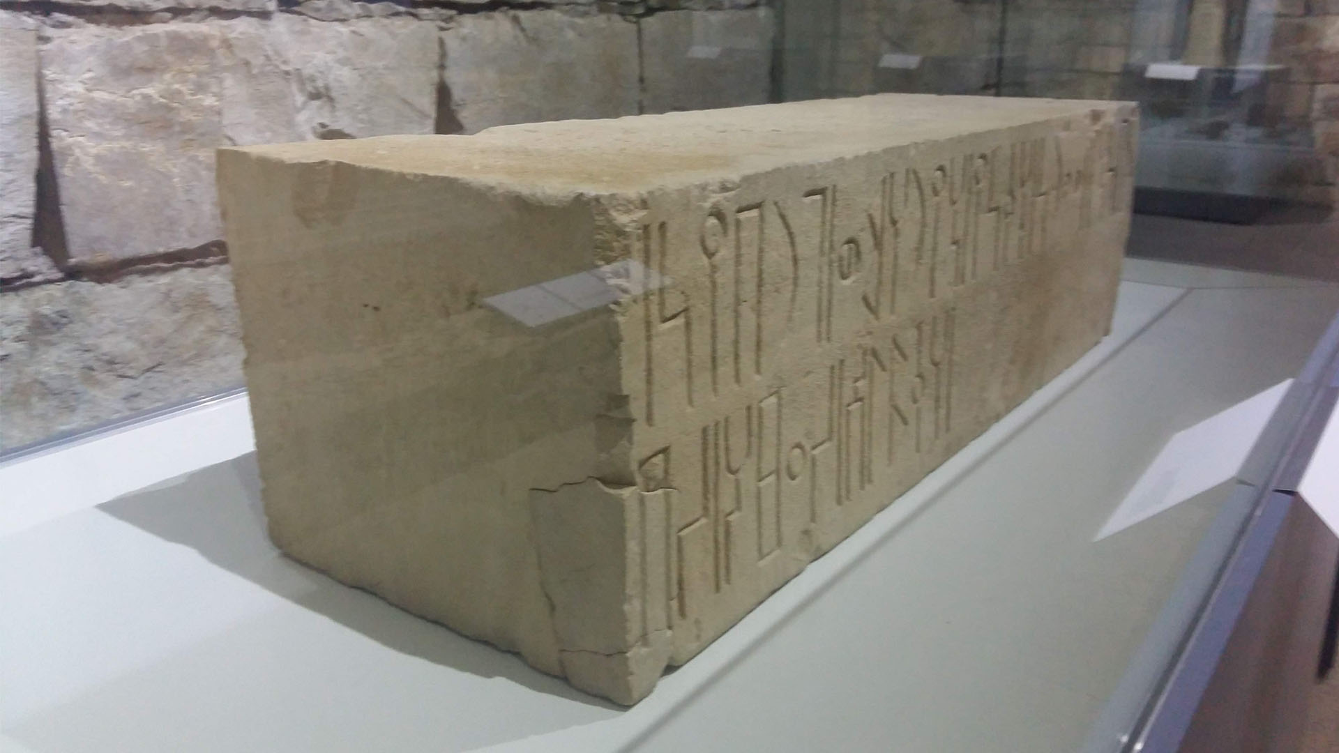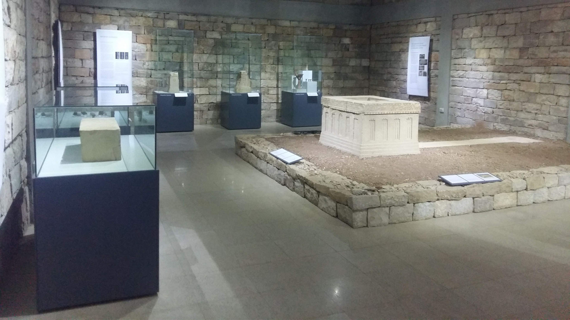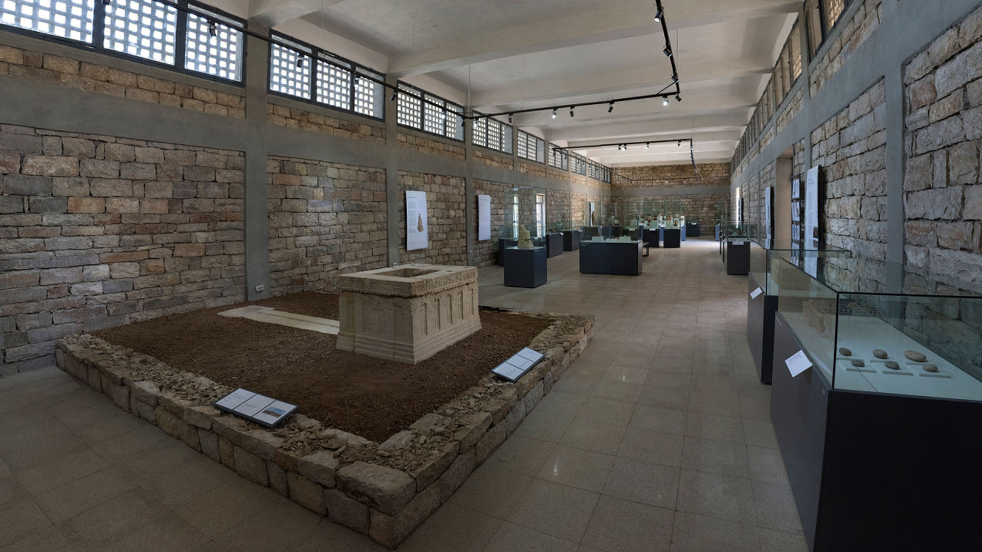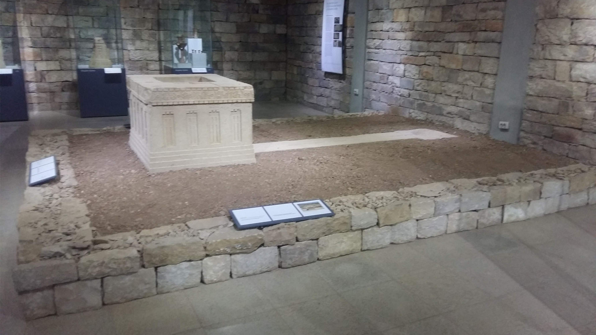 The altar and channel for libations are reconstructed in the museum. Just as striking as this reconstruction is the architecture of the museum building itself: it doesn’t just recede into the background but acts as part of the display. Its massive stone walls accentuate the objects more powerfully than the usual flat painted wall surface; they are a beautiful extension of the display.